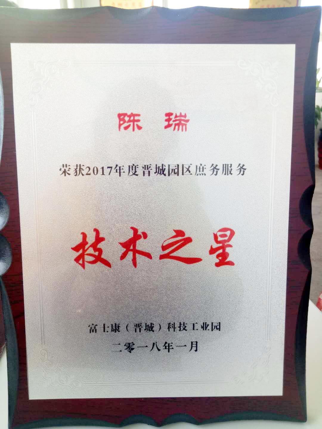 近日,在富士康(晉城)科技工業(yè)園舉辦的2017年度晉城園區(qū)庶務(wù)服務(wù)年終評(píng)比中,我公司員工陳瑞榮獲“技術(shù)之星“的稱(chēng)號(hào),這份榮譽(yù)是陳瑞總結(jié)日常工作所得經(jīng)驗(yàn)再加上自身的刻苦鉆研,勤勞肯干的精神取得的。