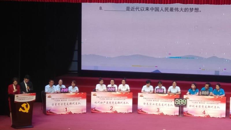 不忘初心跟黨走,牢記使命譜華章!為了慶祝中國(guó)共產(chǎn)黨成立99周年,6月28日下午,晉城市非公企業(yè)黨委在澤州天泰錦辰煤業(yè)有限公司職工文化宮進(jìn)行了一場(chǎng)別開生面的“牢記使命 服務(wù)發(fā)展”黨建知識(shí)競(jìng)賽。潔霸清潔黨支部、現(xiàn)代婦產(chǎn)醫(yī)院黨支部、隆泰實(shí)業(yè)黨總支、神利電器黨支部、眾宸工貿(mào)黨支部和蔬菜公司黨支部等六支代表隊(duì)在此激戰(zhàn)正酣,各代表隊(duì)你追我趕,斗志昂揚(yáng),不甘落后,力爭(zhēng)上游,最終,我公司支部代表隊(duì)榮獲比賽三等獎(jiǎng)。