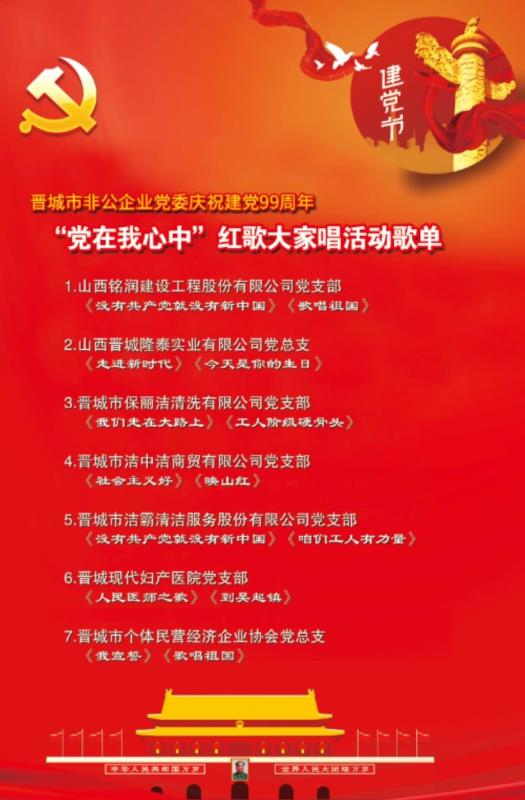 為了慶祝中國共產(chǎn)黨建黨99周年,6月28日,晉城市非公企業(yè)黨委在澤州天泰錦辰煤業(yè)有限公司組織開展了“黨在我心中”紅歌大家唱活動(dòng),潔霸清潔黨支部全體黨員及公司骨干參加演唱活動(dòng)。