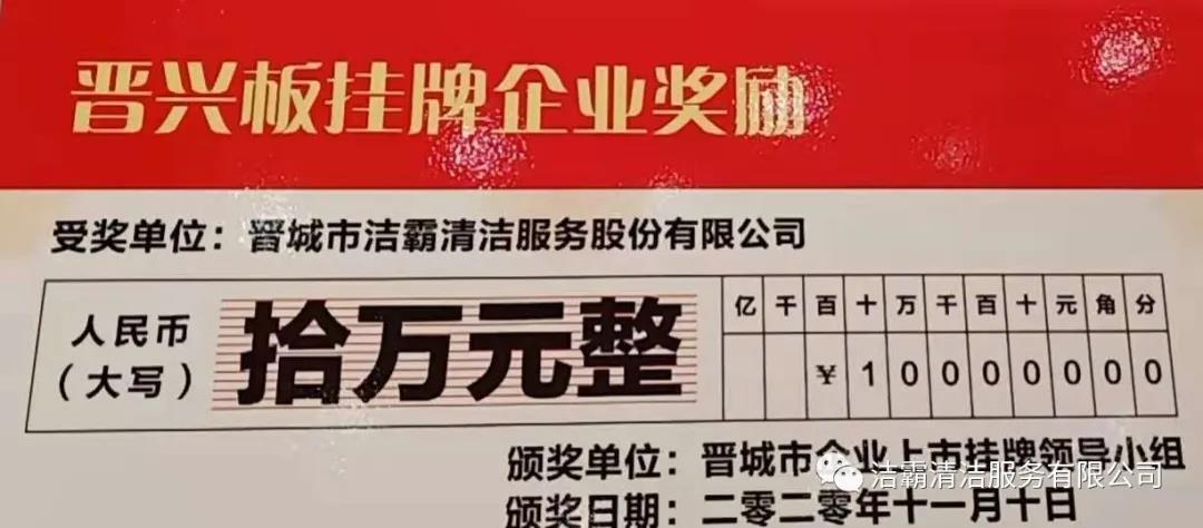 晉城市潔霸清潔服務(wù)股份有限公司于2019年11月27日成功登陸山西股權(quán)交易中心“專精特新板”(晉興板)(企業(yè)代碼:060200Z),是“專精特新板”開板暨首批掛牌的14家企業(yè)之一!皩>匦掳濉笔巧轿鞴蓹(quán)交易中心設(shè)立的特色板塊,為省內(nèi)具備專業(yè)化、精細(xì)化、特色化、新穎化的優(yōu)質(zhì)企業(yè)提供專屬服務(wù),成為帶動(dòng)全省中小企業(yè)創(chuàng)新創(chuàng)造、轉(zhuǎn)型升級(jí),壯大工業(yè)高質(zhì)量發(fā)展的生力軍!皶x興板”掛牌,標(biāo)志著公司正式進(jìn)軍資本市場(chǎng),豐富了融資渠道,推動(dòng)公司高質(zhì)量轉(zhuǎn)型發(fā)展,成為公司發(fā)展的新引擎。