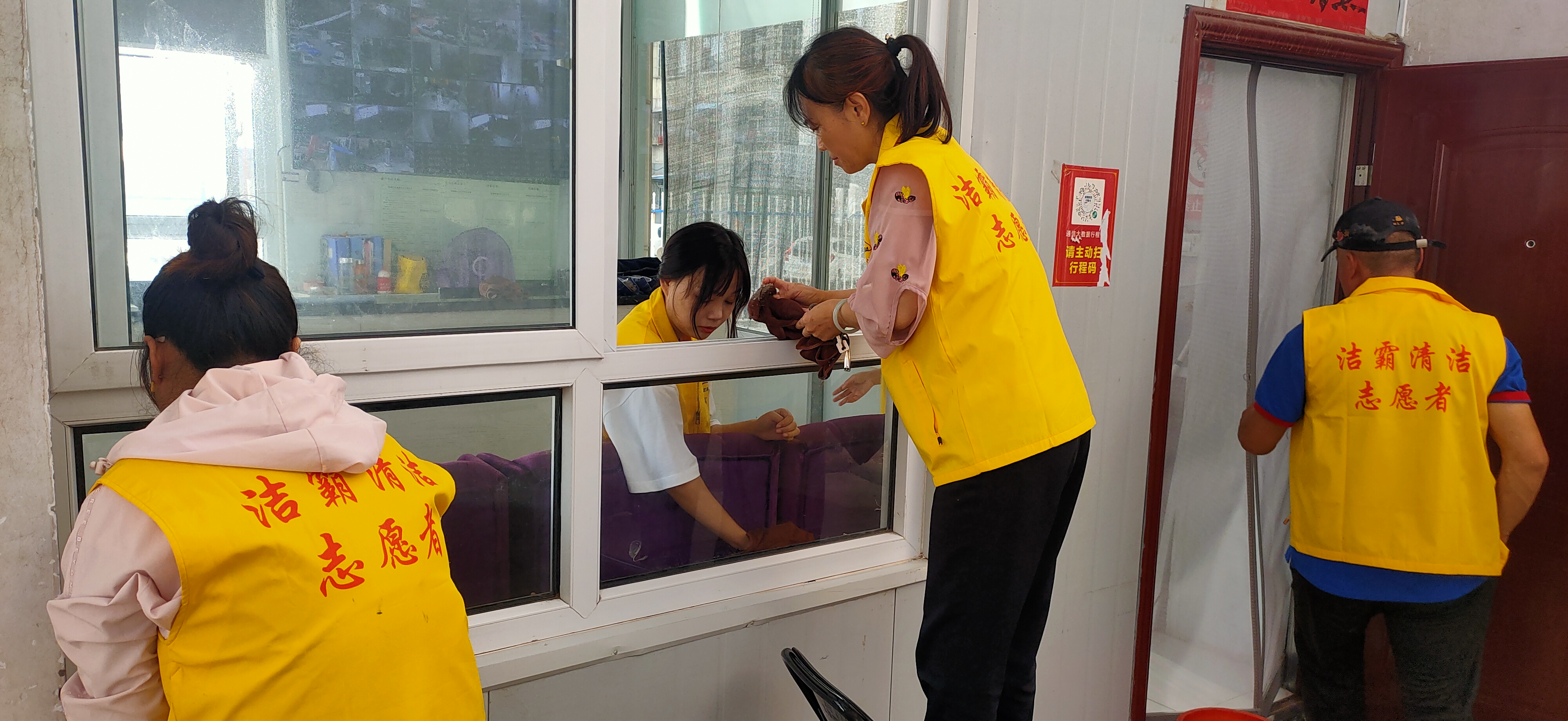 活動現(xiàn)場,志愿者身穿黃色馬甲,自帶玻璃擦、毛巾、笤帚、簸箕等清潔工具,對小區(qū)物業(yè)服務處及小區(qū)環(huán)境進行清潔打掃。他們有的清掃小區(qū)天臺上的垃圾;有的清理樓道門及公共設施上的牛皮癬;有的擦拭門衛(wèi)的玻璃;有的清洗紗窗;有的清洗物業(yè)服務處的玻璃幕墻……志愿者個個干勁十足,不怕臟、不怕累,經過一個多小時的團結協(xié)作,小區(qū)環(huán)境煥然一新。