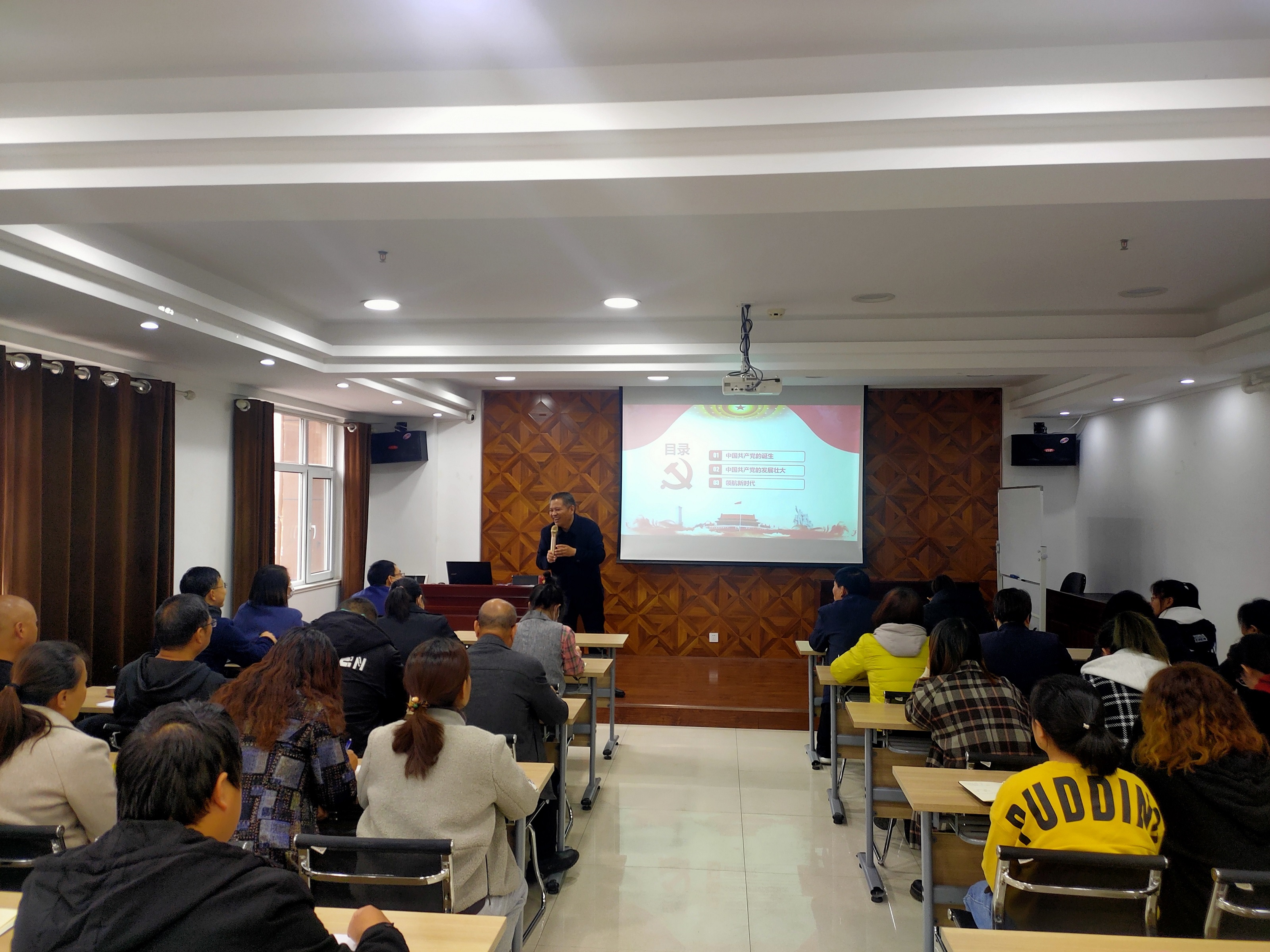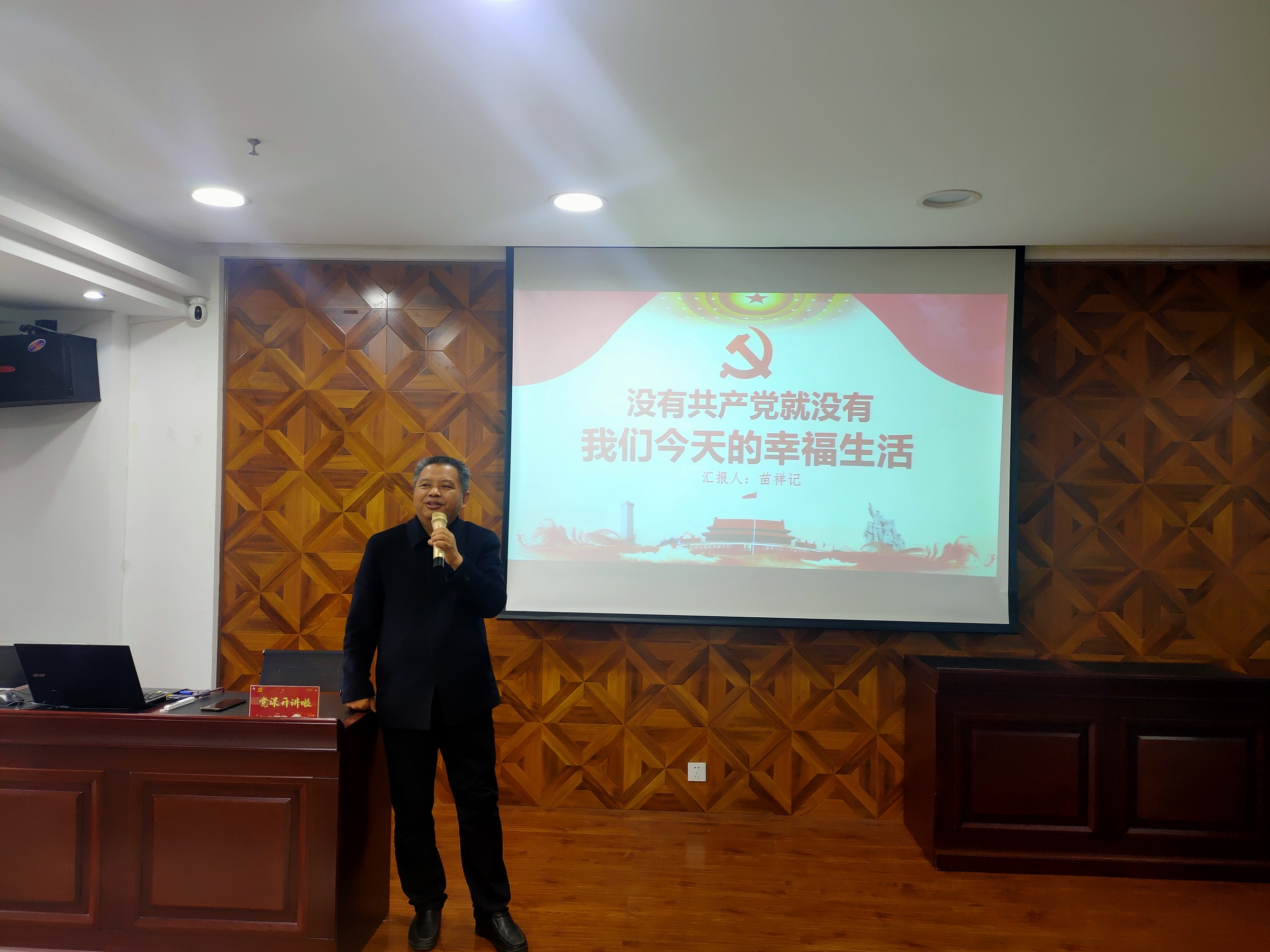 黨課中,苗祥記校長以“沒有共產黨就沒有我們今天的幸福生活”為主題,從1901年清政府簽訂喪權辱國的《辛丑條約》講起,引用大量翔實、生動的歷史資料,對“十月革命”、中國共產黨的誕生、創(chuàng)建井岡山革命根據地、遵義會議、中共中央在延安、中共七大、中共建設社會主義的偉大成就等歷史場景為大家作了系統(tǒng)全面的講解,全景式展現了中國共產黨的誕生、歷經淬煉而逐步發(fā)展、成熟、壯大以及領航新時代的的偉大歷程,闡述了中國共產黨的初心、使命和宗旨,讓與會人員更直觀更深刻認識到沒有共產黨就沒有我們今天的幸福生活,經受了一次深刻的紅色文化洗禮。