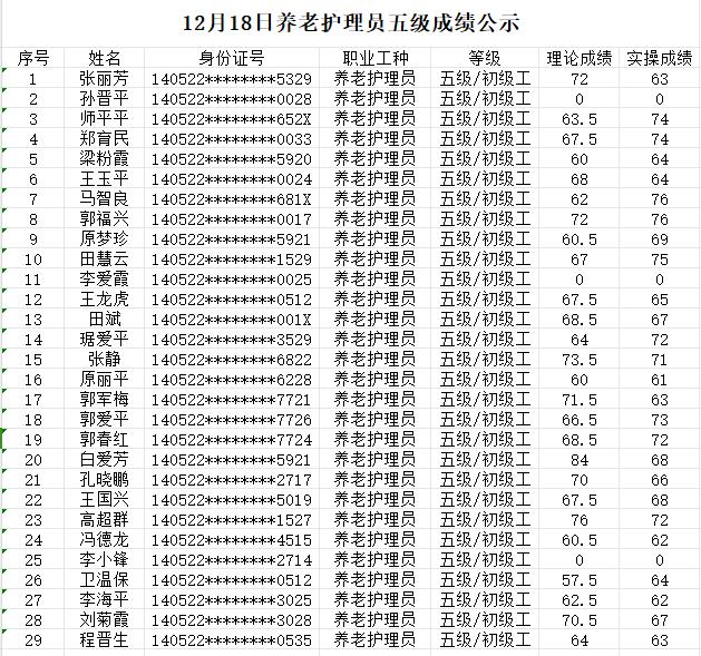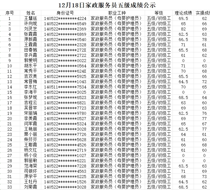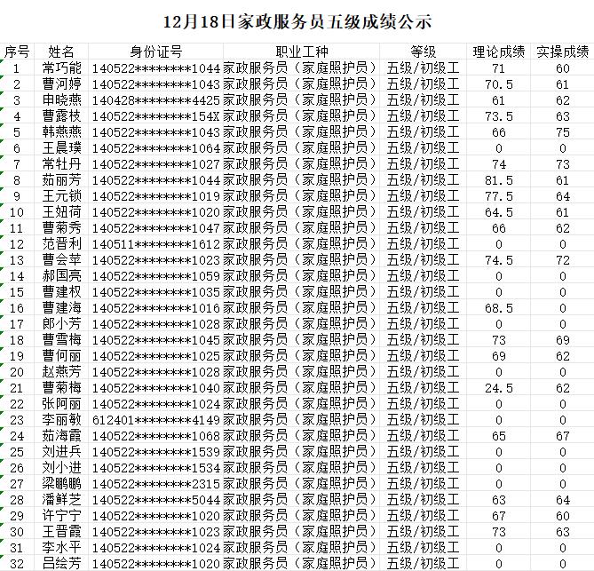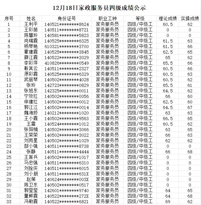 晉城市潔霸清潔服務(wù)股份有限公司 職業(yè)技能等級(jí)認(rèn)定中心 認(rèn)定人員成績(jī)公示