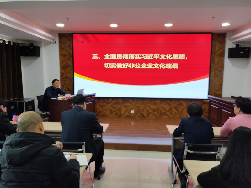 郝天順從習(xí)近平總書記對(duì)宣傳思想文化工作作出的重要指示談起,從“如何認(rèn)識(shí)和理解習(xí)近平文化思想 ”“如何學(xué)習(xí)和貫徹習(xí)近平文化思想”“全面貫徹落實(shí)習(xí)近平文化思想,切實(shí)做好非公企業(yè)文化建設(shè)”三個(gè)方面進(jìn)行了深刻闡述,指出習(xí)近平文化思想既有文化理論觀點(diǎn)上的創(chuàng)新和突破,又有文化工作布局上的部署要求,明體達(dá)用、體用貫通,明確了新時(shí)代文化建設(shè)的路線圖和任務(wù)書,在我國社會(huì)主義文化建設(shè)中展現(xiàn)出了強(qiáng)大偉力,為做好新時(shí)代新征程宣傳思想文化工作、擔(dān)負(fù)起新的文化使命提供了強(qiáng)大思想武器和科學(xué)行動(dòng)指南,并結(jié)合非公企業(yè)實(shí)際,要求要緊緊圍繞學(xué)習(xí)貫徹習(xí)近平文化思想,圍繞貫徹黨的二十大關(guān)于文化建設(shè)的戰(zhàn)略部署,強(qiáng)化黨建引領(lǐng)作用,帶動(dòng)企業(yè)文化發(fā)展,將文化建設(shè)作為企業(yè)戰(zhàn)略,不斷創(chuàng)新文化理念,將企業(yè)文化實(shí)體化、制度化,促進(jìn)企業(yè)文化升華,推動(dòng)各項(xiàng)工作落地見效。