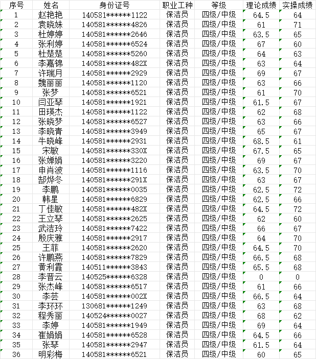 晉城市潔霸清潔服務(wù)股份有限公司職業(yè)技能等級(jí)認(rèn)定中心2024年5月23日第15批保潔員中級(jí)認(rèn)定人員成績公示