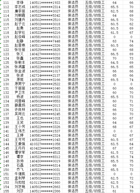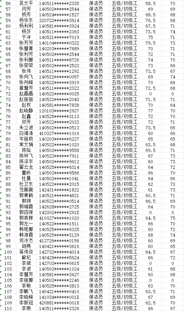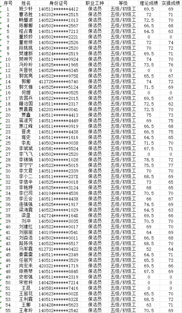 晉城市潔霸清潔服務股份有限公司職業(yè)技能等級認定中心現(xiàn)將2024年7月27日認定人員成績公示如下: