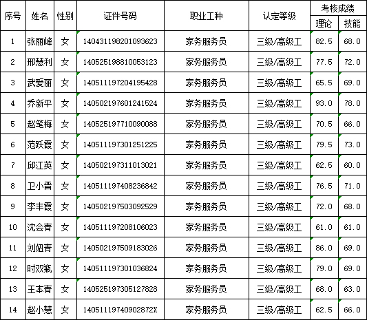 山西潔霸清潔服務(wù)集團(tuán)股份有限公司職業(yè)技能等級(jí)認(rèn)定中心現(xiàn)將2025年9月13日認(rèn)定人員成績(jī)公示如下: