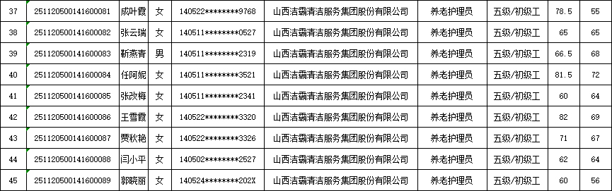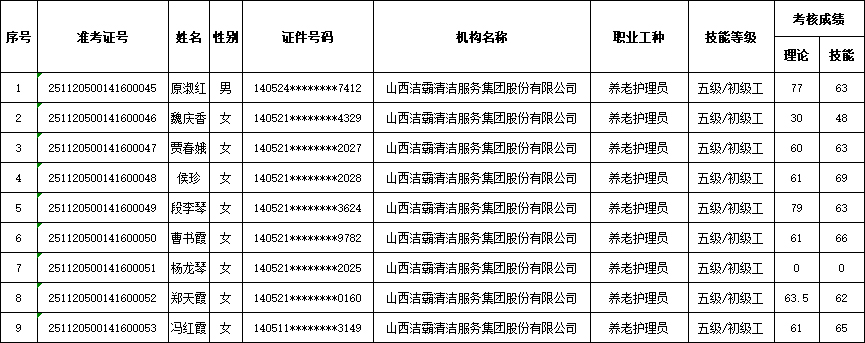 山西潔霸清潔服務(wù)集團(tuán)股份有限公司職業(yè)技能等級(jí)認(rèn)定中心2025年11月23日第5批養(yǎng)老護(hù)理員初級(jí)認(rèn)定人員成績(jī)公示